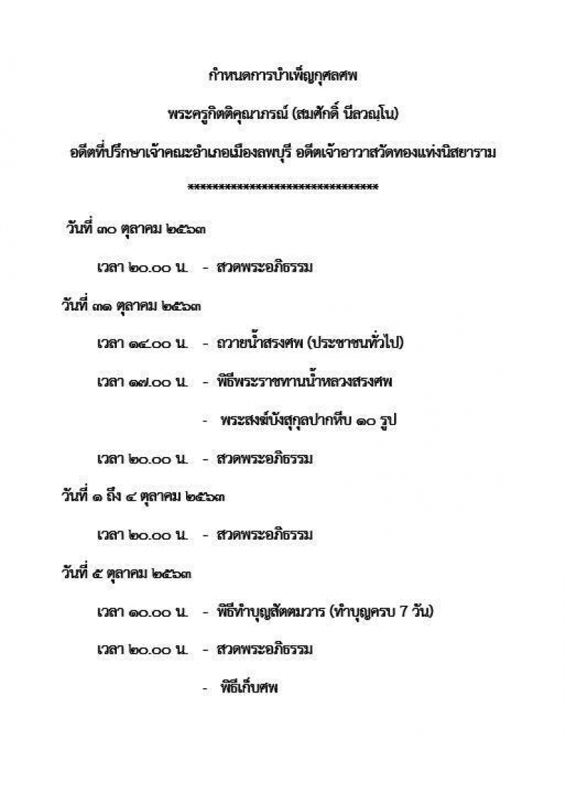 การตั้งศพบำเพ็ญกุศล โดยตั้งสรีระของท่าน ณ ศาลาการเปรียญวัดทองแท่งนิสยาราม โดยในวันพรุ่งนี้ (31 ต.ค.63) เวลา 14 .00 น.จะเปิดให้คณะสงฆ์ และญาติโยม ลูกศิษย์ ทำพิธี สงน้ำศพ และในเวลา 17.00 น.จะทำพิธีน้ำหลวงอาบศพ โดยนายนิวัตน์ รุ่งสาคร ผวจ.ลพบุรี เป็นประธาน และจำการตั้งบำเพ็ญกุศลสวดพระอภิธรรมในเวลา 20.00 น. จนครบ 100 วัน