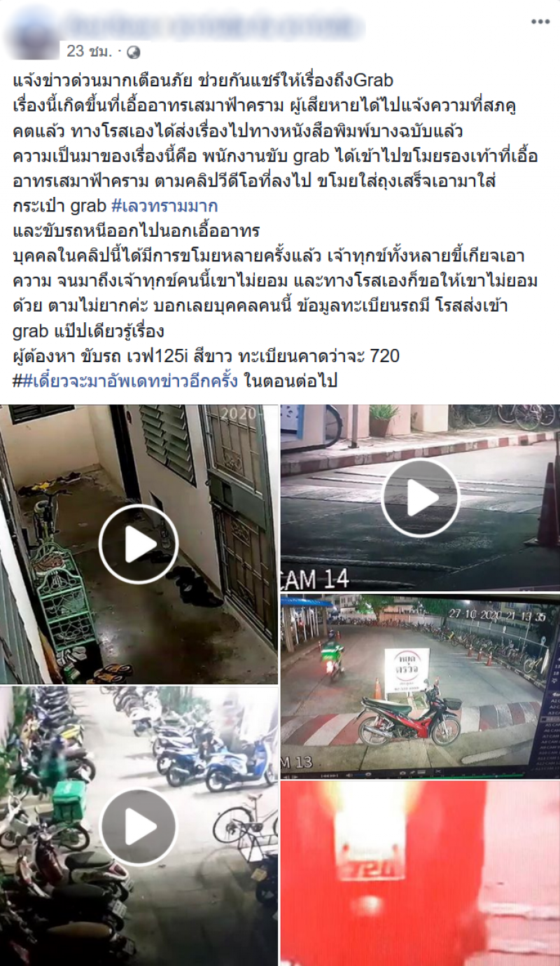 เป็นอีกหนึ่งเรื่อราวเตือนภัย หลังจากที่มีผู้ใช้เฟซบุ๊กรายหนึ่งได้โพสต์คลิปจากกล้องวงจรปิด ขณะที่หนุ่มแต่งกายด้วยชุดพนักงานส่งอาหารออนไลน์ชื่อดัง ในมือถือถุงสีน้ำตาล กำลังเดินไปขโมยรองเท้า ของผู้ที่พักอาศัยภายในบ้านเอื้ออาทรแห่งหนึ่ง บนถนนเสมาฟ้าคราม ตำบลคูคต อำเภอลำลูกกา ปทุมธานี พอได้ของตามที่ต้องการคนร้ายรีบเดินกลับมาที่รถจักรยานยนต์ ที่จอดไว้ด้านหน้าอาคาร ก่อนจะเอาของที่ขโมยมาใส่ในกระเป๋าใส่อาหารสำหรับเก็บความร้อน และขี่หนีออกไป ซึ่งผู้โพสต์เผยว่า หนุ่มรายนี้ก่อเหตุมาแล้วหลายครั้ง แต่หลายคนก็ไม่อยากเอาเรื่อง จนกระทั่งเคสล่าสุดเจ้าของรองเท้าไม่ยอม