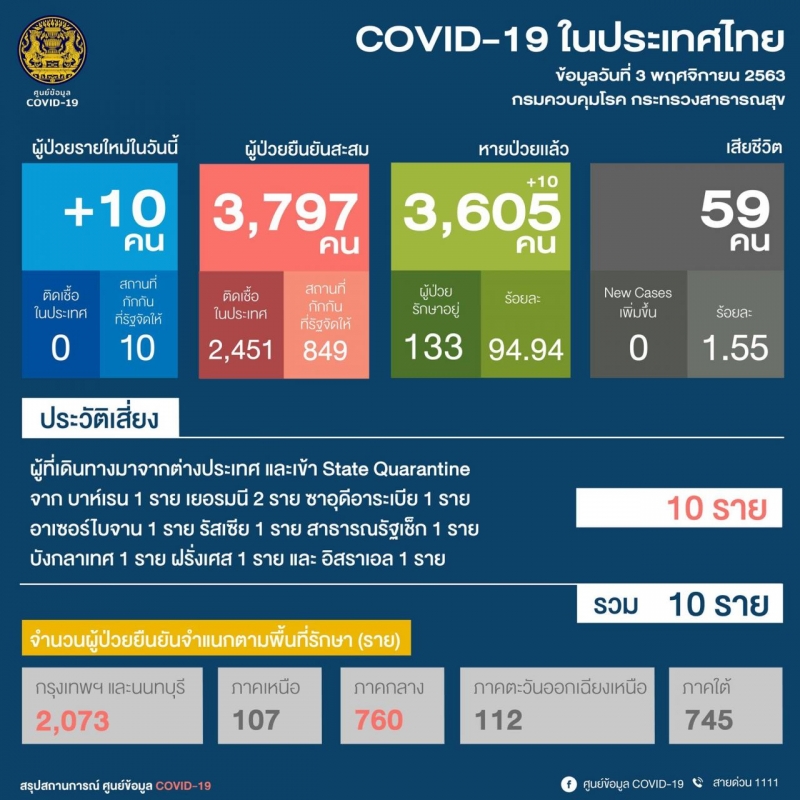 วันที่ 3 พ.ย. 2563 ผู้สื่อข่าวรายงานว่า ศูนย์ข้อมูล COVID-19 รายงานสถานการณ์ผู้ติดเชื้อโคโรนาไวรัส หรือ โควิด-19 ในประเทศไทย โดยมีรายงานดังนี้