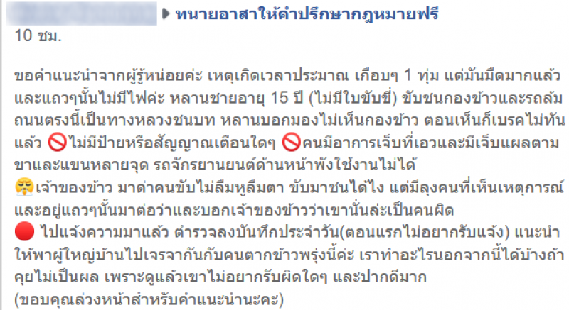 เป็นอีกหนึ่งเรื่องราว ที่ถูกวิพากษ์วิจารณ์อย่างมาก เมื่อมีผู้ใช้เฟซบุ๊กรายหนึ่ง โพสต์ในกลุ่ม ทนายอาสาให้คำปรึกษากฎหมายฟรี โดยระบุว่า ขอคำแนะนำจากผู้รู้หน่อยค่ะ เหตุเกิดเวลาประมาณ เกือบๆ 1 ทุ่ม แต่มันมืดมากแล้ว และแถวๆนั้นไม่มีไฟค่ะ หลานชายอายุ 15 ปี (ไม่มีใบขับขี่) ขับชนกองข้าวและรถล้ม ถนนตรงนี้เป็นทางหลวงชนบท หลานบอกมองไม่เห็นกองข้าว ตอนเห็นก็เบรคไม่ทันแล้ว ไม่มีป้ายหรือสัญญาณเตือนใดๆ คนมีอาการเจ็บที่เอวและมีเจ็บแผลตามขาและแขนหลายจุด รถจักรยานยนต์ด้านหน้าพังใช้งานไม่ได้