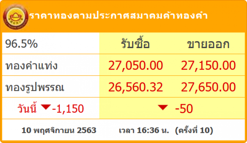 วันที่ 10 พฤศจิกายน 2563 ผู้สื่อข่าวรายงานว่า จากกรณีที่เมื่อช่วงเช้าที่ผ่านมา สมาคมค้าทองคำรายงาน ราคาทองไทย ครั้งที่ 1 เมื่อเวลา 09.27 น. โดยราคาทองล่าสุดวันนี้ เปิดตลาดเช้าราคาได้มีการลดลงมากถึง 1,200 บาท เป็นการปรับลดทีเดียวมากสุดในรอบปี โดยทองคำแท่ง รับซื้อบาทละ 27,000 ขายออกบาทละ 27,100 บาท ส่วนทองรูปพรรณ รับซื้อบาทละ 26,514.84 ขายออกบาทละ 27,600 บาท