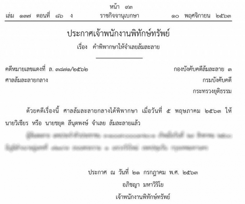 ราชกิจจาฯ ออกประกาศเผยแพร่ ให้บุคคลนามสกุลดัง ลีนุตพงษ์ ล้มละลาย