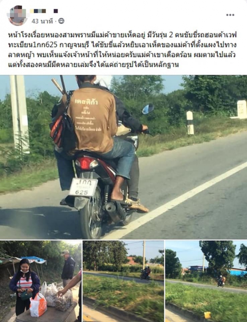 จากกรณีที่ สภ.ลาดหญ้า จ.กาญจนบุรี เร่งติดตามล่าตัว 2 โจรแสบ หลังก่อเหตุขี่รถจักรยานยนต์ ขโมยเห็ดโคนจากแม่ค้าที่ขายเห็ดโคนข้างทางกลางวันแสก ๆ ล่าสุดรู้ตัวเจ้าของรถที่ใช้ก่อเหตุแล้ว มั่นใจได้ตัวแน่ โดยมีพลเมืองดีขี่รถตามไปถ่ายรูปป้ายทะเบียนรถของคนร้าย ที่ก่อเหตุเอาไว้ได้อย่างชัดเจนนั้น