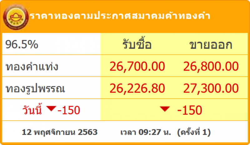 วันที่ 12 พฤศจิกายน 2563 ผู้สื่อข่าวรายงานว่า สมาคมค้าทองคำรายงาน ราคาทองไทย ครั้งที่ 1 เมื่อเวลา 09.27 น. โดยราคาทองล่าสุดวันนี้ เปิดตลาดเช้าราคาได้มีการลดลงมาอีก 150 บาท เรียกได้ว่าเป็นการปรับลดลงต่อเนื่องในรอบปีที่ใกล้แตะ 26,000 โดยราคาล่าสุดในวันนี้ทองคำแท่ง รับซื้อบาทละ 26,700ขายออกบาทละ 26,800 บาท ส่วนทองรูปพรรณ รับซื้อบาทละ 26,226.80 ขายออกบาทละ 27,300 บาท