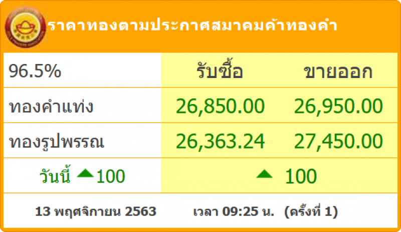 วันที่ 13 พฤศจิกายน 2563 ผู้สื่อข่าวรายงานว่า สมาคมค้าทองคำรายงาน ราคาทองไทย ครั้งที่ 1 เมื่อเวลา 09.25 น. โดยราคาทองล่าสุดวันนี้ เปิดตลาดเช้าราคาได้มีการขึ้นมาา 100 บาท หลังจากที่ช่วงที่ผ่านมา มีการปรับลดลงอย่างต่อเนื่องโดยราคาล่าสุดในวันนี้ทองคำแท่ง รับซื้อบาทละ 26,850 ขายออกบาทละ 26,950 บาท ส่วนทองรูปพรรณ รับซื้อบาทละ 26,363.24 ขายออกบาทละ 27,450 บาท