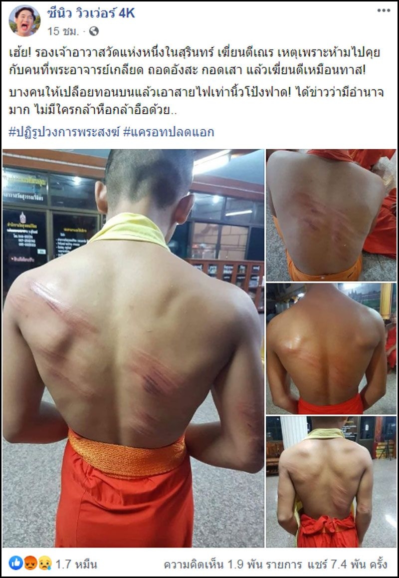 จากกรณีที่โลกออนไลน์แชร์ภาพ รองเจ้าอาวาสวัดดัง จ.สุริทร์ สั่งให้สามเณรรูปหนึ่งกอดเสา ถอดอังสะออก แล้วใช้สายไฟตีจนหลังและแขนเป็นรอยช้ำ พร้อมมีอาการปูดบวม มีเลือดไหลซิบๆ ตามบริเวณแผล ซึ่งสาเหตุเกิดจากการไปคุยกับคนที่พระอาจารย์เกลียด จนเป็นที่วิพากษ์วิจารณ์อย่างกว้างขวางนั้น