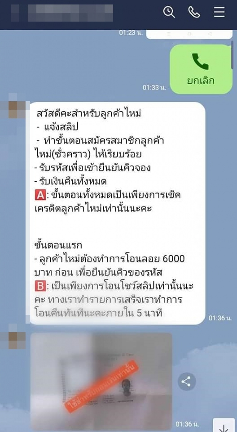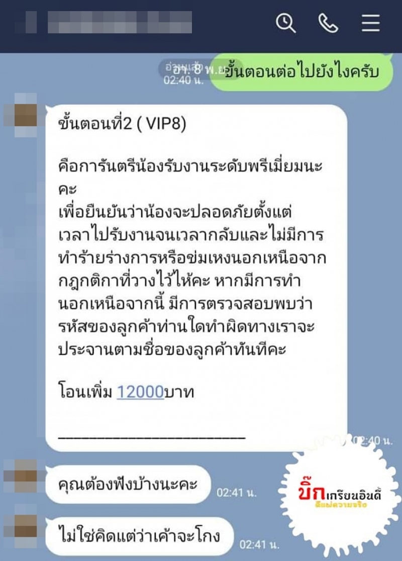 เพราะเป็นกฎการยกเลิกงาน แต่ตนบอกว่ามีเพียง 2,000 บาทเท่านั้น อีกฝ่ายก็บอกว่า 2,000 บาทก็เอา จึงยอมโอนไป และถูกบล็อกทุกช่องทาง ติดต่อไม่ได้