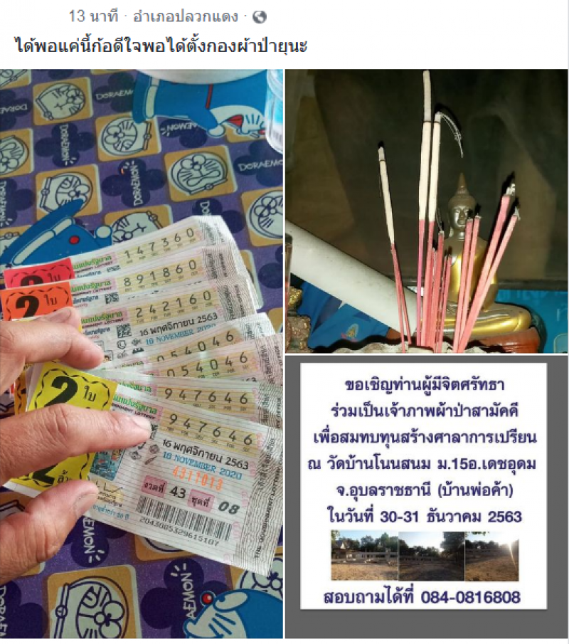 ล่าสุดมีรายงานว่าในโซเชียลต่างฮือฮา หลังจากที่เมื่อ 10 ชม.ก่อน ผู้ใช้เฟซบุ๊กรายหนึ่ง ได้นำเลขมาแบ่งปันโดยเป็นเลขที่ได้จากธูปไอ้ไข่..บูชามาขอกองผ้าป้าไปสร้างศาลาการเรียญที่บ้านกองล่ะ 199 บาท ต่อมาหลังประกาศผลรางวัล เลขที่หนุ่มรายนี้ได้มาก็ถูกจริงๆ โดยเจ้าตัวเตรียมนำเงินรางวัลที่ได้ ไปร่วมทำบุญกับกองผ้าป่าที่นำมา