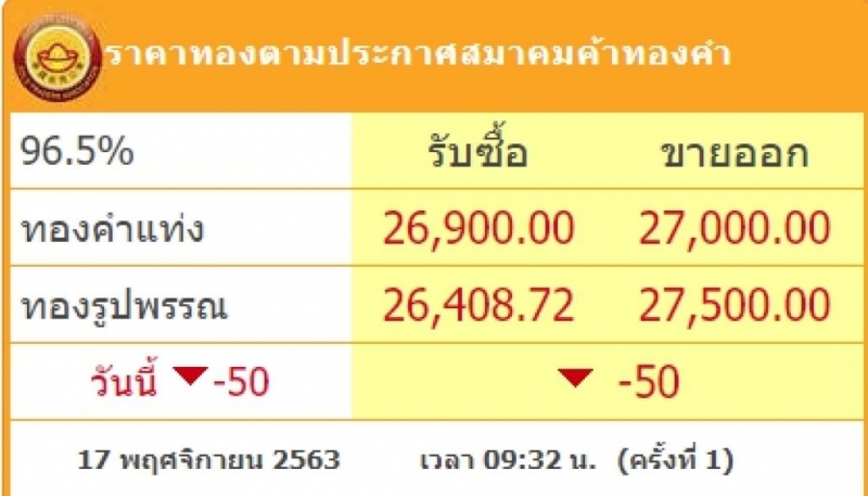 ราคาทองวันนี้ ราคาทองคำประจำวันอังคารที่ 17 พฤศจิกายน 2563 เวลา 09.32 (ครั้งที่1) ราคาทองคำปรับลง 50 บาท