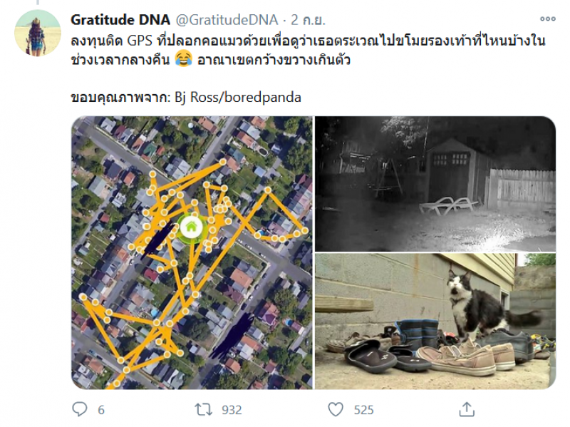 ลงทุนติด GPS ที่ปลอกคอแมวด้วยเพื่อดูว่าเธอตระเวณไป ขโมย รองเท้าที่ไหนบ้างในช่วงเวลากลางคืน อาณาเขตกว้างขวางเกินตัว