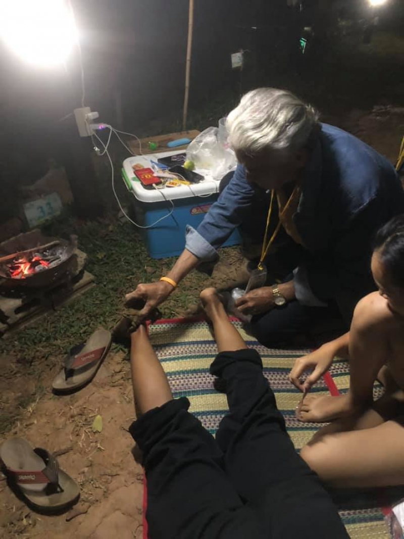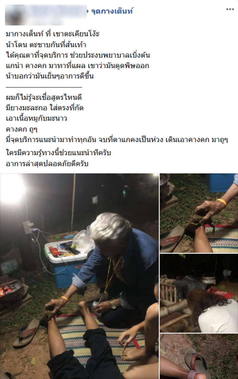 มากางเต็นท์ ที่ เขาตะเคียนโง๊ะ น้าโดน ตะขาบกันที่ส้นเท้า ได้คุณตาที่จุดบริการ ช่วยประงบพยาบาลเบิ่งต้น แกนำ คางคก มาทาที่แผล เขาว่ามันดูดพิษออก น้าบอกว่ามันเย็นๆอาการดีขึ้น