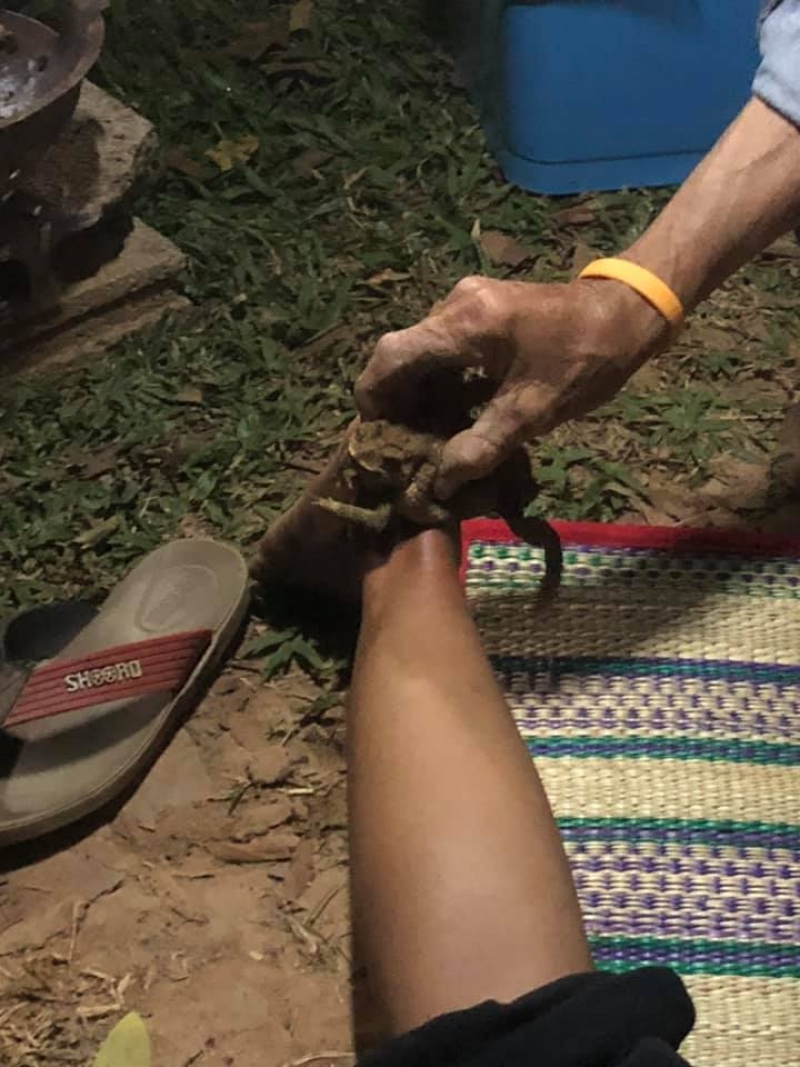 มากางเต็นท์ ที่ เขาตะเคียนโง๊ะ น้าโดน ตะขาบกันที่ส้นเท้า ได้คุณตาที่จุดบริการ ช่วยประงบพยาบาลเบิ่งต้น แกนำ คางคก มาทาที่แผล เขาว่ามันดูดพิษออก น้าบอกว่ามันเย็นๆอาการดีขึ้น