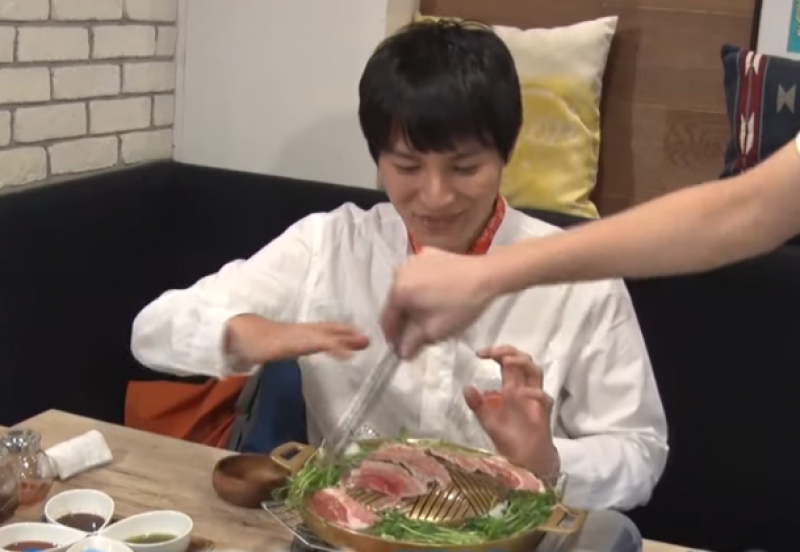 ทางร้านสาธิตวิธีการทานหมูกระทะแบบไทยไทยเรานี่แหละค่ะ วางหมูลงบนกระทะ และต้มผักลงรอบๆ แถมใช้กระทะทองเหลือที่เราคุ้นหน้าคุ้นตาเป็นอย่างดีด้วยนะ ทางรายการถึงกับบอกว่า นี่มันภาชนะไฮบริด ไม่ใช่แค่ปิ้งย่างยากินิคุ แต่สามารถทำชาบูชาบูได้อีกด้วยยย (ว๊าววว)