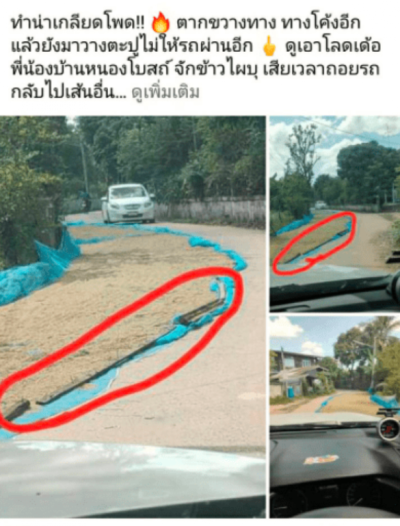 จากกรณีที่โลกโซเชียลได้มีการแชร์ภาพชาวบ้านตากข้าวไว้บนถนนพร้อมกับใช้ไม้หน้าสามตอกตะปูวางกันไว้ไม่ให้รถเหยียบทำให้มีผู้ใช้เฟซบุ๊กแชร์ออกไปเป็นจำนวนมาก ซึ่งเหตุภาพดังกล่าวเกิดขึ้นที่หมู่ 13 บ้านหนองโบสถ์พัฒนา ตำบลดงเค็ง อำเภอหนองสองห้อง จังหวัดขอนแก่น สอบถามผู้ใหญ่บ้าน เกี่ยวกับข้อเท็จจริงดังกล่าวว่ามีการใช้ไม้หน้าสามตอกตะปูวางทับผ้าตาข่ายที่ใช้สำหรับตากข้าวตามที่เป็นข่าวในโลกโซเชียลในขณะนี้หรือไม่