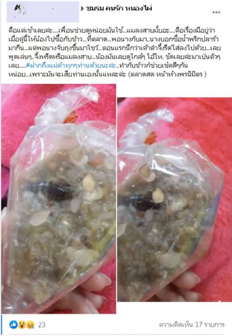 ล่าสุดผู้โพสต์ ซึ่งเป็นหญิงวัย 26 ปี เผยว่ามาเฝ้าไข้อยู่ที่โรงพยาบาลหนองไผ่ ในช่วงเช้าวันนี้ ได้ให้น้องสาวออกไปหาซื้อกับข้าวที่ตลาดสดแห่งหนึ่ง ซึ่งก็ได้ทั้ง น้ำพริกปลาร้า ผักต้ม น้ำเต้าหู้ ขนม และเมื่อเตรียมเปิดรับประทาน สายตาก็ได้สะดุดกับส่วนผสมในถุงน้ำพริกปลาร้า ซึ่งซื้อมาในราคา 10 บาท ตอนแรกยังคุยกันว่า สงสัยแม่ค้าตำจิ้งหรีดเป็นส่วนผสม แต่เมื่อจับถุงพลิกดูไปมา ก็ต้องพากันผงะ เมื่อส่วนผสมในถุงน้ำพริกปลาร้า ไม่ใช่จิ้งหรีดอย่างที่คิด แต่กลับเป็นแมลงสาบตัวลายทั้งตัว จึงตัดสินใจถ่ายรูป ถ่ายคลิปไว้ เพียงเพื่ออยากฝากเตือนให้ บรรดาพ่อค้าแม่ค้า ควรหมั่นดูแลความสะอาด ให้ถูกสุขอนามัย และตรวจสอบสินค้าให้ดีก่อนวางขาย ซึ่งส่วนตัวก็ไม่ได้รู้สึกติดใจอะไร และได้นำไปทิ้งเป็นที่เรียบร้อย