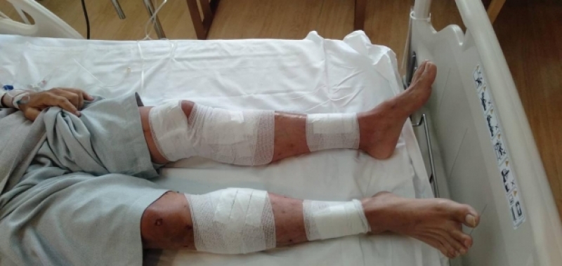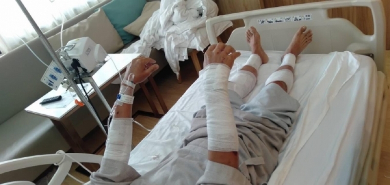 อันนี้คือหนึ่งในคนที่โดนน้ำใส่สารเคมีเมื่อวันที่17 เป็นแผลต้องแอดมิต เพราะต้องให้ล้างแผลให้ทุกวัน(ทรายขออนุญาตไม่ลงรูปแผลนะคะ เดี๋ยวตกใจกัน ให้เห็นตำแหน่งว่าโดนทั่วตัวจริงๆ ทรายกับพี่บุ๊งดูแลอยู่ค่ะ แจ้งเพื่ออัปเดต ส่วนการ์ดที่ถูกยิง ออกมาพักที่บ้านได้แล้ว1 อีก1ยังพักฟื้นค่ะพร้อมทั้งบอกต่อว่า แผลจริงน่ากลัวมาก แงงงงง