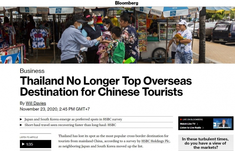 สถานีโทรทัศน์บลูมเบิร์กของสหรัฐฯ รายงานผลสำรวจของธนาคารเอชเอสบีซีล่าสุด ที่พบข้อมูลว่า ประเทศไทยไม่ใช่สถานที่ท่องเที่ยวอันดับ 1 ที่ครองใจนักท่องเที่ยวจากจีนอีกต่อไป เพราะถูกญี่ปุ่นและเกาหลีใต้ แซงไปเป็นที่เรียบร้อยแล้ว