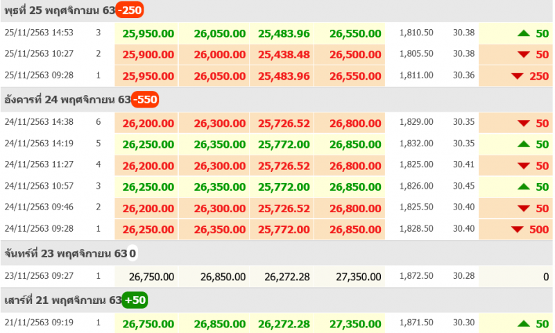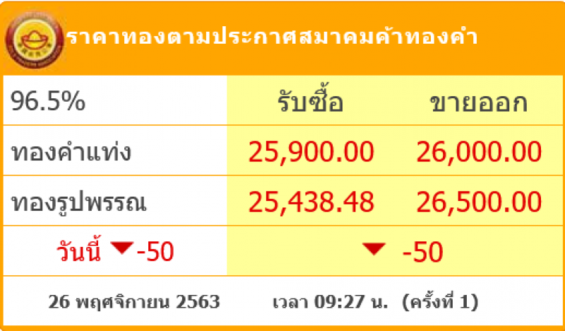 วันที่ 26 พฤศจิกายน 2563 สมาคมค้าทองคำรายงาน ราคาทองไทยวันนี้ เมื่อเวลา 09:27 น. โดยราคาทองปรับลงอีก 50 หลังจากที่เมื่อวานนี้ราคาทองปรับลง 250 ทองคำแท่ง รับซื้อ 25,900.00 ขายออก 26,000.00 ทองรูปพรรณ รับซื้อ 25,438.48 ขายออก 26,500.00
