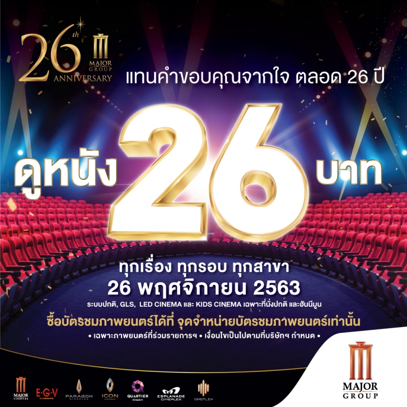วันที่ 26 พฤศจิกายน 2563 จากกรณีที่ทาง เมเจอร์ ซีนีเพล็กซ์ ฉลองครบรอบ 26 ปี แทนคำขอบคุณจากใจ ชวนคุณร่วมเฉลิมฉลองความสุขสุดพิเศษ ดูหนังสุดคุ้ม กับแคมเปญ "26th Anniversary Major Group" เฉพาะวันที่ 26 พฤศจิกายน 2563 วันเดียวเท่านั้น ลูกค้าซื้อบัตรชมภาพยนตร์ในราคาพิเศษ 26 บาท ที่จุดจำหน่ายบัตรชมภาพยนตร์เท่านั้น