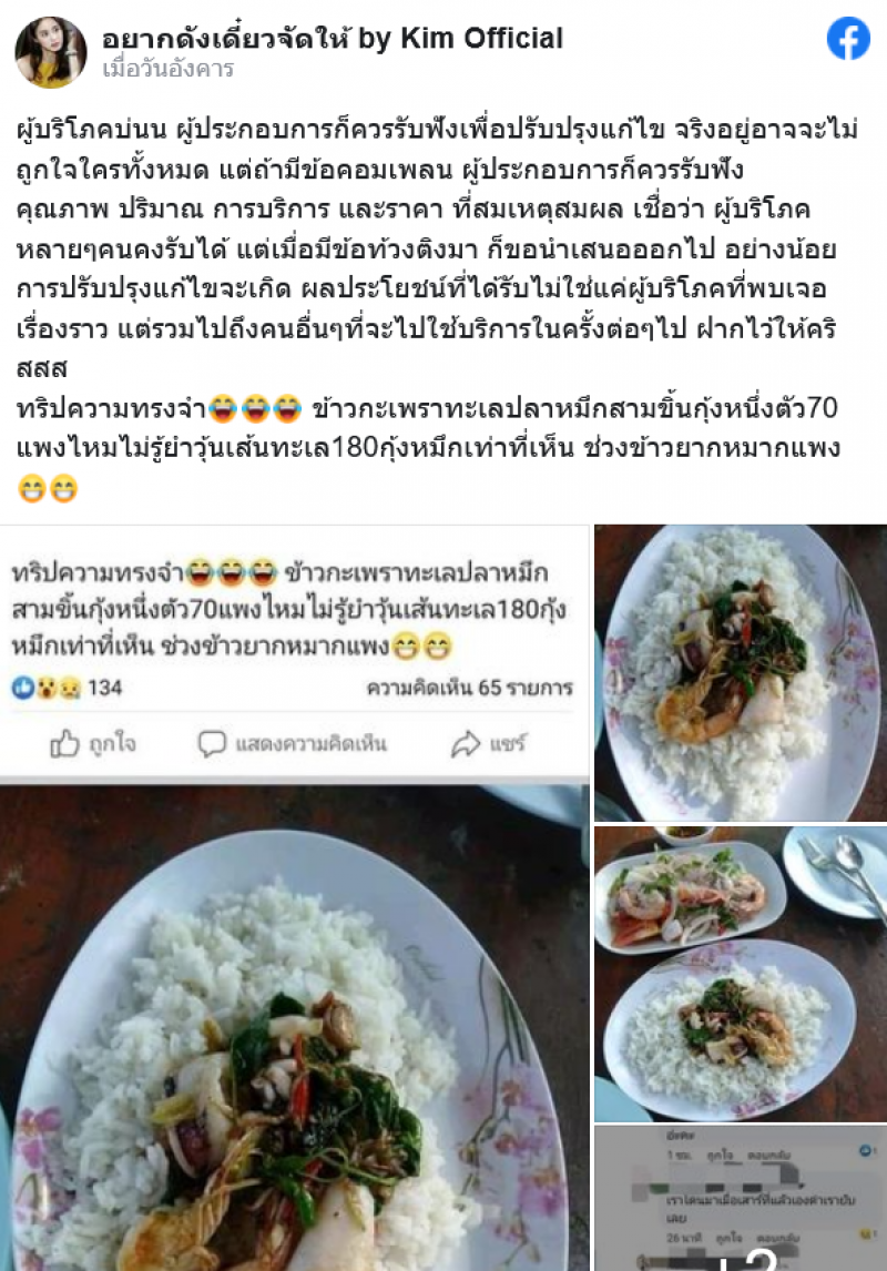 จากกรณีโลกออนไลน์ได้แชร์ข้อมูลของผู้ใช้เฟซบุ๊กรายหนึ่ง ที่โพสต์ภาพจานอาหาร 2 จาน พร้อมข้อความ ระบุว่า ทริปความทรงจำ ข้าวกะเพราทะเลปลาหมึก สามชิ้นกุ้งหนึ่งตัว 70 แพงไหมไม่รู้ ยำวุ้นเส้นทะเล 180 กุ้งหมึกเท่าที่เห็น ช่วงข้าวยากหมากแพง โดยโพสต์ดังกล่าวมีการส่งต่อและเกิดการวิพากษ์วิจารณ์เป็นอย่างมาก ถึงคุณภาพ ปริมาณ และราคา ว่าสมเหตุสมผลกันหรือไม่