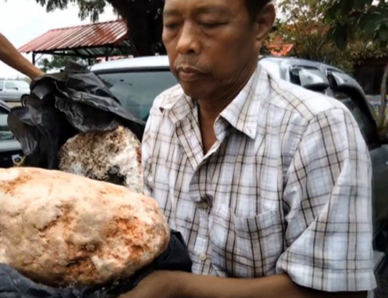 วันที่ 26 พ.ย. 63 มีรายงานจากนายนริศ สุวรรณสังข์ หรือ "ลุงไข่" อายุ 60 ปี ชาว ต.แหลมตะลุมพุก อ.ปากพนัง จ.นครศรีธรรมราช ว่าเมื่อช่วงเช้าวันที่ 23 พ.ย.ที่ผ่านมา ขณะกำลังเดินออกกำลังกายอยู่ริมชายหาดทะเลบริเวณหมู่บ้านแหลมตะลุมพุก ก็ได้พบก้อนสีขาว ๆ เหลือง ๆ ขนาดใหญ่เกยชายหาด 1 ก้อน และก้อนขนาดเล็กอีก 2-3 ก้อน ขณะนั้นยังไม่รู้ว่าเป็นก้อนอะไร แต่ก็ได้ชักชวนญาติ ๆ ช่วยกันยกก้อนประหลาดดังกล่าวกลับบ้าน