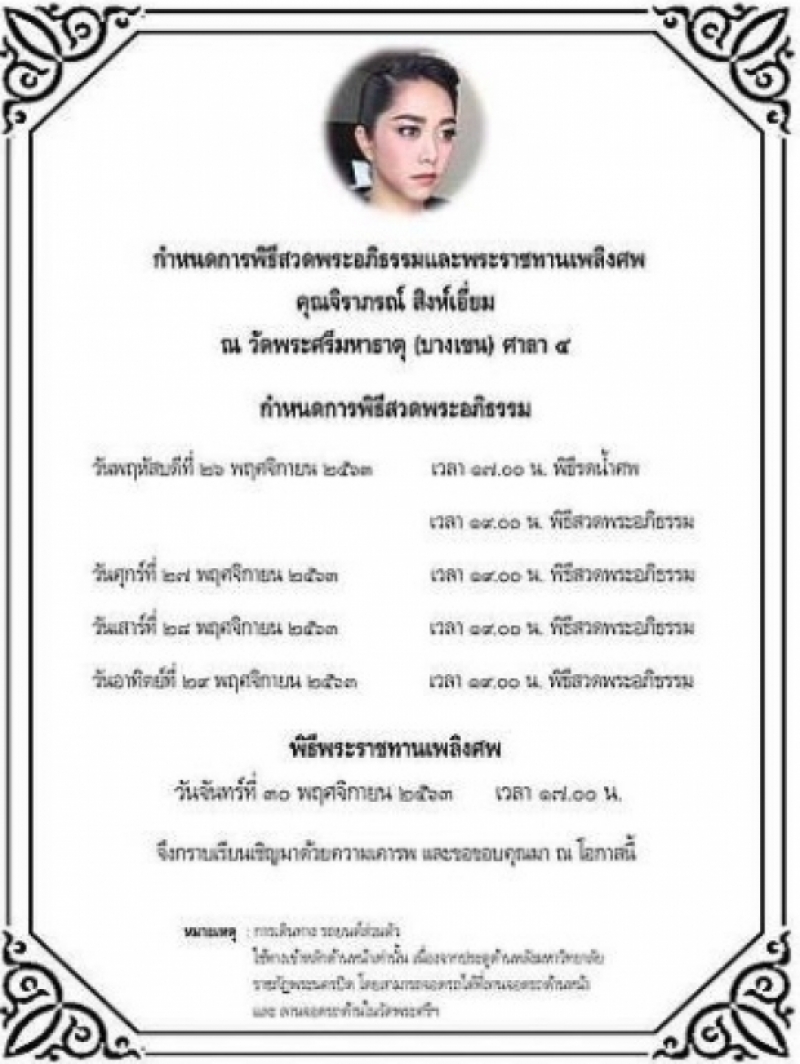 สำหรับพิธีสวดพระอภิธรรมศพของ จูน จิราภรณ์ จะมีขึ้นในวันที่ 26-29 พ.ย. ที่ ศาลา 4 วัดพระศรีมหาธาตุวรมหาวิหาร (บางเขน) โดย 17.00 น.วันนี้ จะมีพิธีรดน้ำศพ ส่วนพิธีพระราชทานเพลิงศพ จะมีขึ้นในวันจันทร์ที่ 30 พ.ย. เวลา 17.00 น.