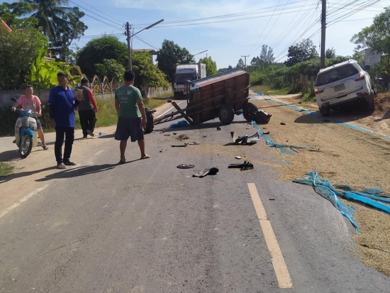 เถียงกันเดือด หลังรถยนต์หักหลบกองข้าว ชนรถอีแต๋นชาวบ้าน
