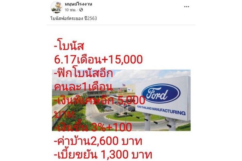 วันที่ 27 พฤศจิกายน 2563 ผู้สื่อข่าว siamtopic ได้รับรายงานว่า โลกออนไลน์มีการแชร์การประกาศโบนัสของ โรงงานฟอร์ด ไทยแลนด์ แมนูแฟคเจอริ่ง (เอฟทีเอ็ม) ผ่านเพจเฟซบุ๊ก มนุษย์โรงงาน พร้อมระบุข้อความว่า โบนัสฟอร์ดระยอง ปี2563 โดยภายในภาพมีการแจกแจงรายละเอียดโบนัสประจำปี 2563 ที่พนักงานของบริษัทดังกล่าวจะได้รับดังนี้