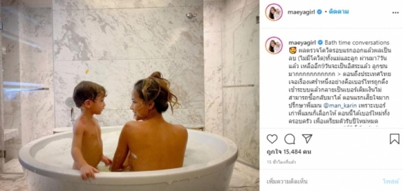 ล่าสุด เธอกลับมาไทยแล้วแต่อยู่ในขั้นตอนการกักตัวตามมาตรการป้องกันเชื้อโควิด-19 เป็นเวลา 14 วัน โดยเธอได้เผยผลตรวจโควิดครั้งแรก พร้อมทั้งเรื่องที่เศร้าเสียใจเมื่อกลับมาว่า "Bath time conversations ผลตรวจโควิดรอบแรกออกแล้วผลเป็นลบ (ไม่มีโควิด)ทั้งแม่และลูก ผ่านมา7วันแล้ว เหลืออีก9วันจะเป็นอิสระแล้ว ลูกซนมากกกกกกกกกกก ตอนถึงประเทศไทย