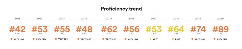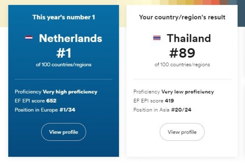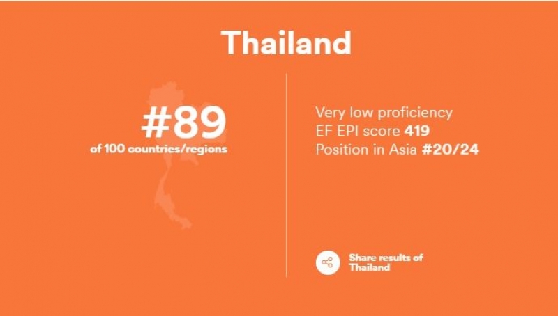 โดยพบว่าปีนี้ ทักษะความสามารถด้านภาษาอังกฤษของคนไทยร่วงต่อเนื่องเป็นปีที่สี่ติดต่อกัน อยู่ในอันดับที่ 89 จากทั้งหมด 100 ประเทศ และอยู่ในอันดับที่ 20 จาก 24 ประเทศในเอเชีย ซึ่งไทยได้ผลคะแนนรวม 48.54 ซึ่งจัดว่าอยู่ใน 'ระดับต่ำมาก' (very low proficiency)
