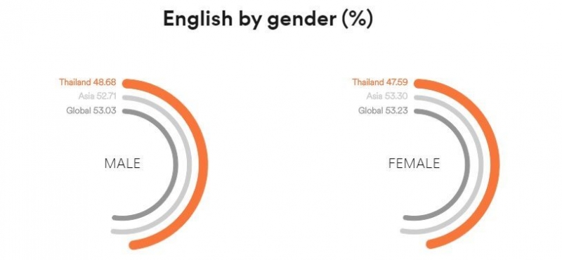 หากย้อนไปในปี 2019 ทักษะความสามารถด้านภาษาอังกฤษของคนไทยอยู่ในอันดับที่ 74 จากทั้งหมด 100 ประเทศ ด้วยคะแนน 47.62 ขณะที่ปี 2018 อยู่ในอันดับ ที่ 64 จากทั้งหมด 88 ประเทศ ด้วยคะแนน 48.54 และขณะที่ปี 2017 อยู่ในอันดับ 53 จากทั้งหมด 80 ประเทศด้วยคะแนน 49.7 ดัชนีพบว่าผู้ชายไทยได้คะแนนสูงกว่าผู้หญิงเล็กน้อยโดยมีคะแนน 48.68 และ 47.59 ตามลำดับ แต่ยังคงต่ำกว่าค่าเฉลี่ยทั่วโลกที่ 53.03 สำหรับผู้ชาย และ 53.23 สำหรับผู้หญิง