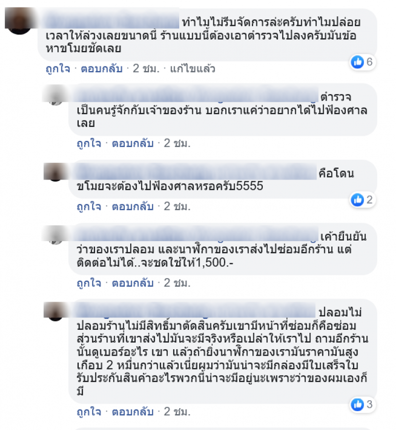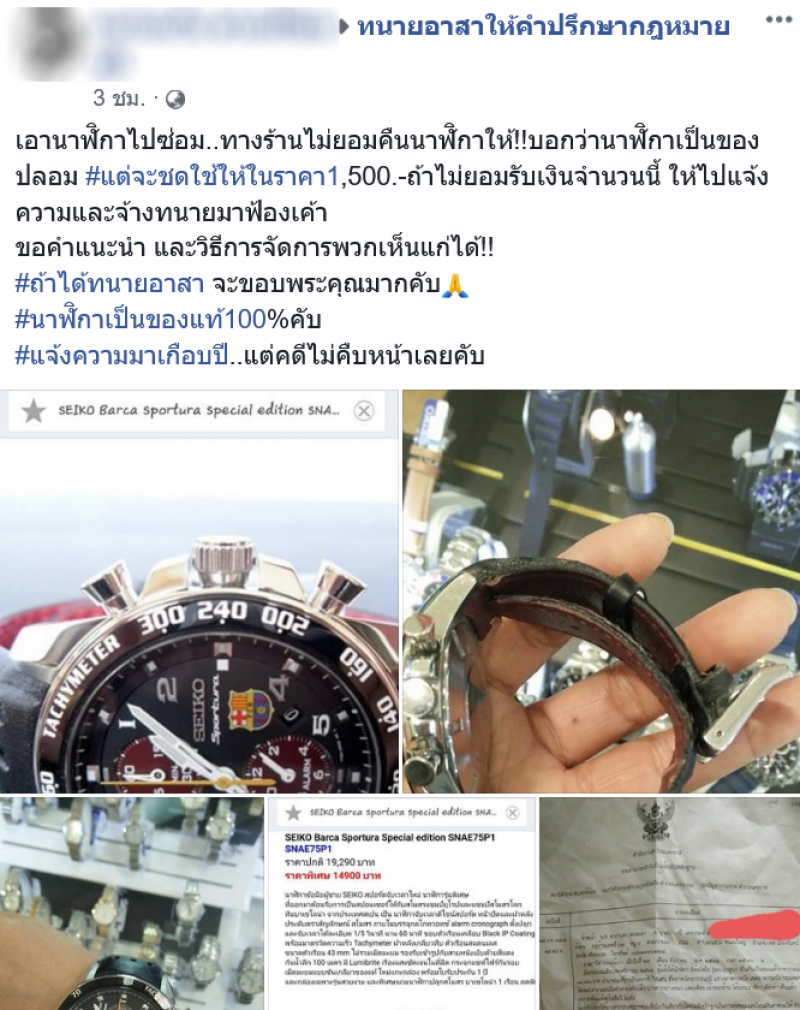 เรียกได้ว่าเป็นอีกหนึ่งเรื่องราว ที่เรียกเสียงวิพากษ์วิจารณ์อย่างมาก หลังจากที่หนุ่มรายหนึ่ง ได้โพสต์ขอความช่วยเหลือลงในกลุ่ม ทนายอาสาให้คำปรึกษากฎหมายฟรี โดยระบุว่า เอานาฬิกาไปซ่อม ทางร้านไม่ยอมคืนนาฬิกาให้ บอกว่านาฬิกาเป็นของปลอม แต่จะชดใช้ให้ในราคา1,500.ถ้าไม่ยอมรับเงินจำนวนนี้ ให้ไปแจ้งความและจ้างทนายมาฟ้องเค้า ขอคำแนะนำ และวิธีการจัดการพวกเห็นแก่ได้