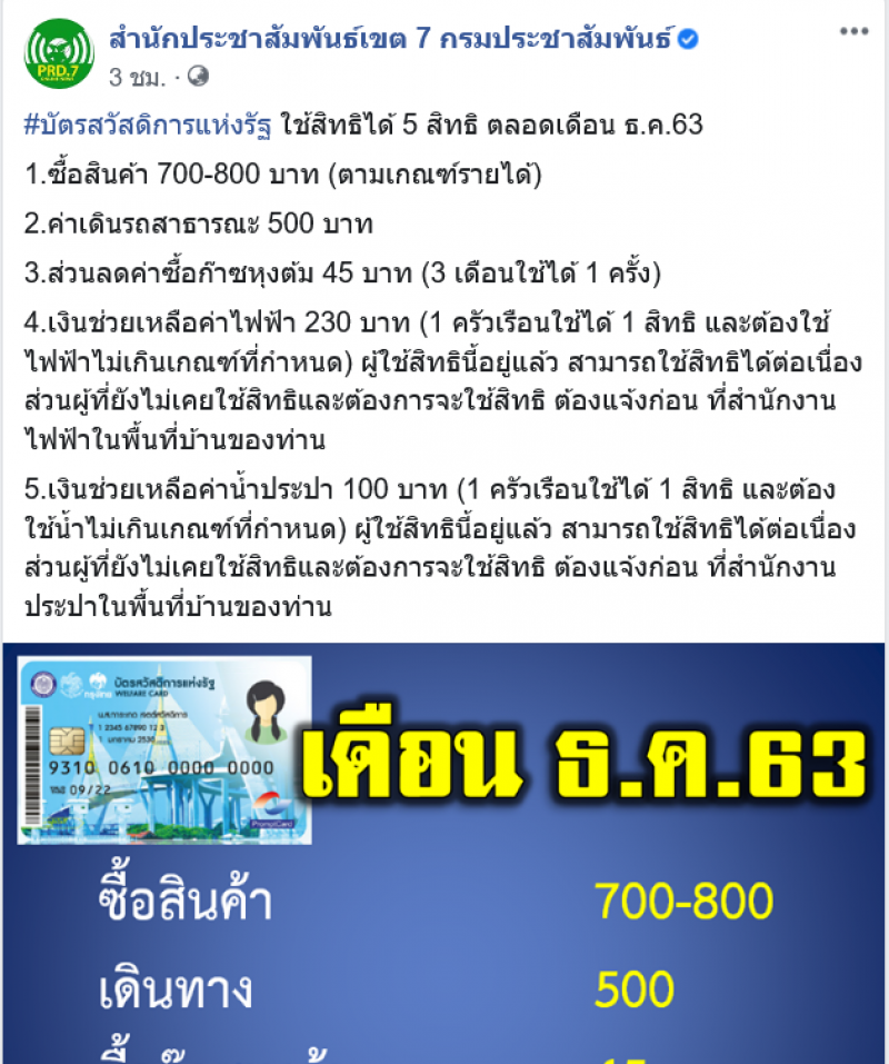 เพจเฟซบุ๊กชื่อ สำนักประชาสัมพันธ์เขต 7 กรมประชาสัมพันธ์ ได้โพสต์สิทธ์ที่คนถือบัตรคนจนจะได้รับในเดือนธันวาคม โดยระบุว่า บัตรสวัสดิการแห่งรัฐ ใช้สิทธิได้ 5 สิทธิ ตลอดเดือน ธ.ค.63