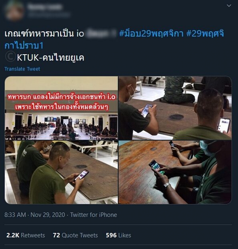 จากกรณีผู้ใช้ทวิตเตออร์รายหนึ่งโพสต์ภาพทหารสวมเสื้อยืด กองทัพบก ถือโทรศัพท์คนละเครื่อง โดยระบุข้อความทางทวิตเตอร์ว่า เกณฑ์ทหารมาเป็น IO นั้น ล่าสุด เมื่อเวลาประมาณ 14.58 น. วันที่ 29 พฤศจิกายน เฟซบุ๊ก Army Spoke Team และทวิตเตอร์ Royal Thai Army ของกองทัพบก ได้กล่าวถึงกรณีดังกล่าวว่า ด้วยมีผู้ไม่หวังดี นำภาพทหารใช้โทรศัพท์ไปสร้างข่าวเท็จในทวิตเตอร์ว่าทหารทำ IO ข้อเท็จจริงคือ ภาพดังกล่าวเป็นภาพที่หน่วยฝึกทหารใหม่ให้เวลาทหารได้ใช้โทรศัพท์ติดต่อกับครอบครัวในช่วงการฝึกทหารใหม่