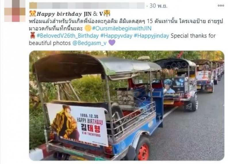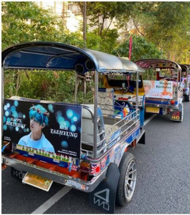 และล่าสุด แฟนคลับของ วงบีทีเอส หรือที่เรียกว่า อาร์มี่ ได้โพสต์คลิปวิดีโอ การซื้อโฆษณาแฮปปี้เบิร์ธเดย์ 2 สมาชิก จิน และ วี ที่มีวันเกิดในเดือนธันวาคมนี้ โดย วี เกิดวันที่ 30 ธันวาคม ขณะที่ จิน เกิดวันที่ 4 ธันวาคม ซึ่งได้ใช้รถตุ๊กตุ๊ก ทั้งหมด 15 คัน ที่จะขับรอบเมือง ให้แฟนๆที่เจอได้ถ่ายภาพมาอวดกันได้