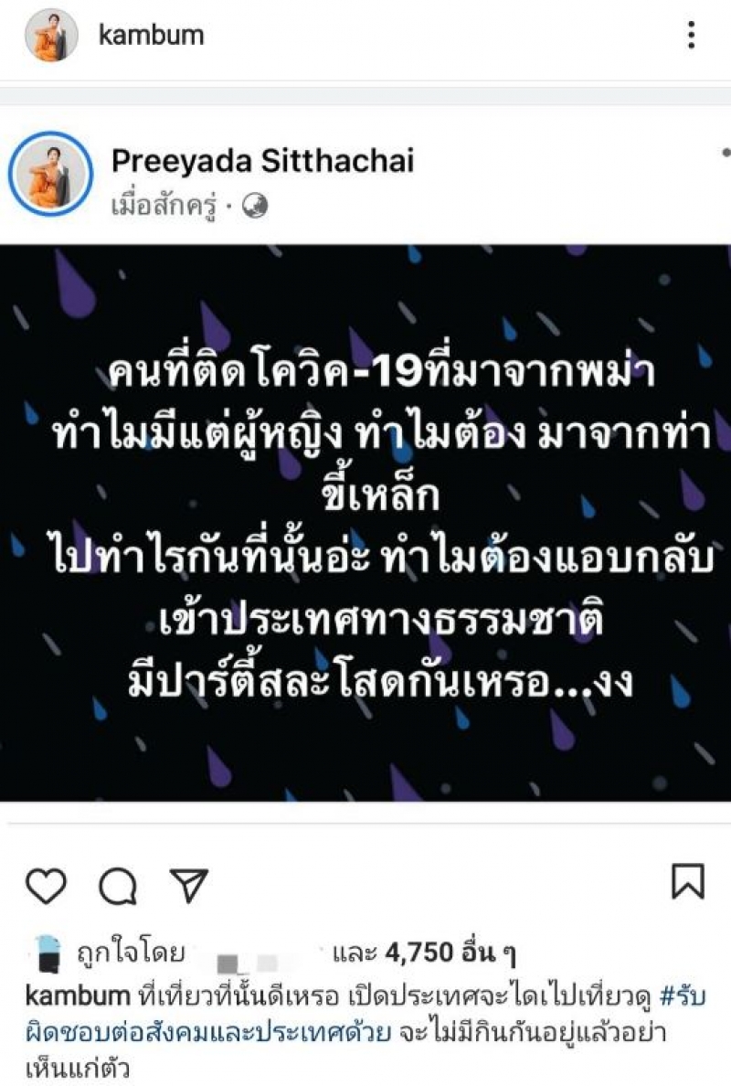จากเรื่องที่เกิดขึ้นดาราสาวอย่างแก้มบุ๋ม ปรียาดา ก็ได้ออกมาโพสต์ถึงบรรดาผู้ติดเชื้อทั้งหลาย ระบุ Preeyada Sitthachai โพสต์ คนที่ติดโควิค-19 ที่มาจากพม่าทำไมมีแต่ผู้หญิง ทำไมต้องมาจากท่าขี้เหล็ก ไปทำไรกันที่นั้นอ่ะ ทำไมต้องแอบกลับเข้าประเทศทางธรรมชาติ