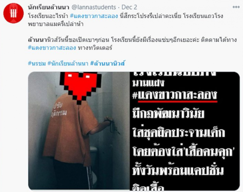 จากกรณีที่เพจนักเรียนล้านนาได้แชร์ภาพนักเรียนสวมเสื้อสีน้ำตาล เขียนด้านหลังเสื้อว่า ปรับพฤติกรรม โดยระบุว่า "โรงเรียนอะไรน้า #แดงขาวกาสะลองนี่สีกระโปรงรึเปล่าคะเนี่ยโรงเรียนแถวโรงพยาบาลแมครึเปล่าน้า ล้านนานิวส์วันนี้ขอเปิดเบาๆก่อนโรงเรียนนี้ยังมีเรื่องแซ่บๆอีกเยอะค่ะติดตามได้ทาง#แดงขาวกาสะลองทางทวิตเตอร์#นรชม#นักเรียนล้านนา#ล้านนานิวส์"