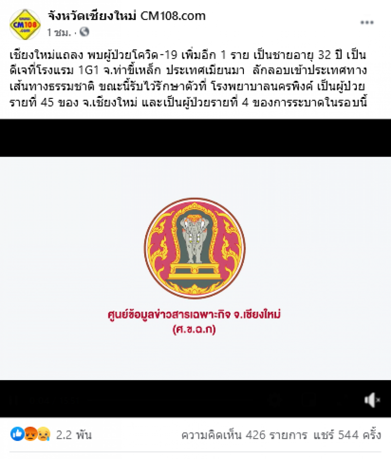 เพจเฟซบุ๊ก จังหวัดเชียงใหม่ CM108.com รายงานว่าพบผู้ติดเชื้อโควิด-19 เพิ่ม 1 ราย ผู้ชายอายุ 32 ปี เป็นดีเจที่โรงแรม 1G1 จ.ท่าขี้เหล็ก ประเทศเมียนมา ชายคนนี้ลักลอบเข้าประเทศทางเส้นทางธรรมชาติ ขณะนี้รับไว้รักษาตัวที่ โรงพยาบาลนครพิงค์ เป็นผู้ป่วยรายที่ 45 ของ จ.เชียงใหม่ และเป็นผู้ป่วยรายที่ 4 ของการระบาดในรอบนี้