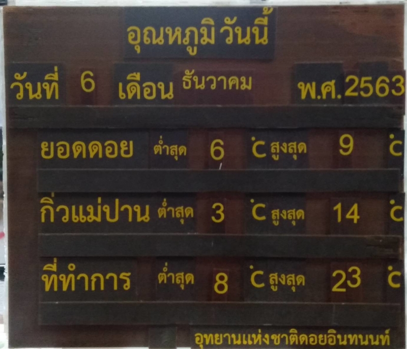 วันที่ 6 ธ.ค. 63 นายเกรียงไกร ไชยพิเศษ หัวหน้าอุทยานแห่งชาติดอยอินทนนท์ อ.จอมทอง จ.เชียงใหม่ เปิดเผยว่า อากาศในเขตอุทยานแห่งชาติดอยอินทนนท์ อุณหภูมิลดฮวบฮาบ ที่บริเวณกิ่วแม่ปาน อุณหภูมิเช้านี้วัดได้ 3 องศา ที่ยอดดอยวัดได้ 6 องศา ที่ทำการอุทยานวัดได้ 8 องศา