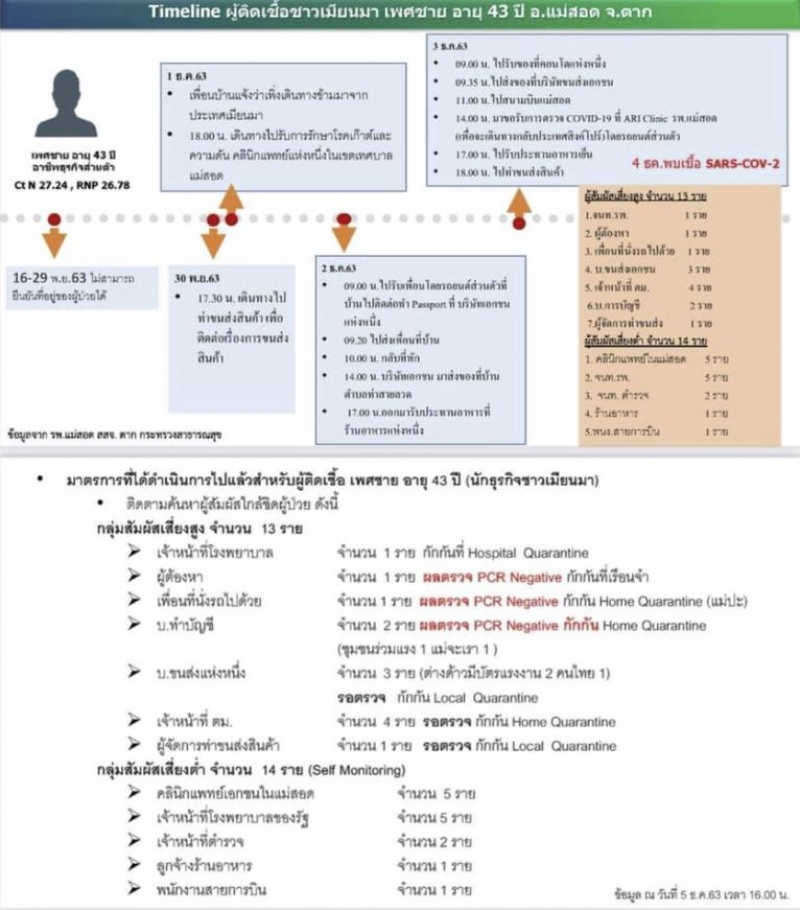 ในรอบวันนี้ 6ธ.ค.63 ได้มีกระเเสข่าวที่สร้างความหวาดวิตก เเละผวาอย่างหนักให้กับคนไทย เกี่ยวกับการเเพร่ระบาดของเชื้อโควิด-19 โดยมีรายงานว่า พบคนไทยสูงอายุประมาณ 80 ปี เป็นชาวบ้านบ้านวังตะเคียนใต้ ตำบลท่าสายลวด อำเภอแม่สอด จังหวัดตาก เรียกรถกู้ชีพของโรงพยาบาลแม่สอดอินเตอร์ฯ ซึ่งเป็นโรงพยาบาลเอกชนไปรับ ระหว่างทางคนไข้เกิดอาการหนัก จึงต้องรีบนำส่งโรงพยาบาลแม่สอด เบื้องต้นแจ้งว่าเป็นผู้ป่วยติดเตียง ป่วยโรคหวัดธรรมดา