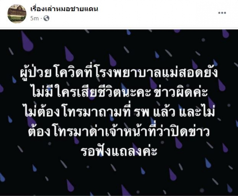 วันที่ 6ธ.ค.63 พญ.ณัฐกานต์ ชื่นชม แพทย์ประจำโรงพยาบาลแม่สอด จังหวัดตาก เผยผ่านเพจ เรื่องเล่าหมอชายแดน ปฎิเสธข่าวที่เผยเเพร่กันไปว่า มีผู้ป่วยสูงอายุติดเชื้อโควิด-19เสียชีวิตเเล้ว พร้อมยืนยัน ผู้ป่วยโควิดที่โรงพยาบาลเเม่สอดยังไม่มีใครเสียชีวิต ข่าวผิด ไม่ต้องโทรมาถามที่รพ.เเล้ว เเละไม่ต้องโทรมาด่าเจ้าหน้าที่ว่าปิดข่าว ข้อเท็จจริงอย่างชัดเจนให้รอฟังเเถลงข่าว