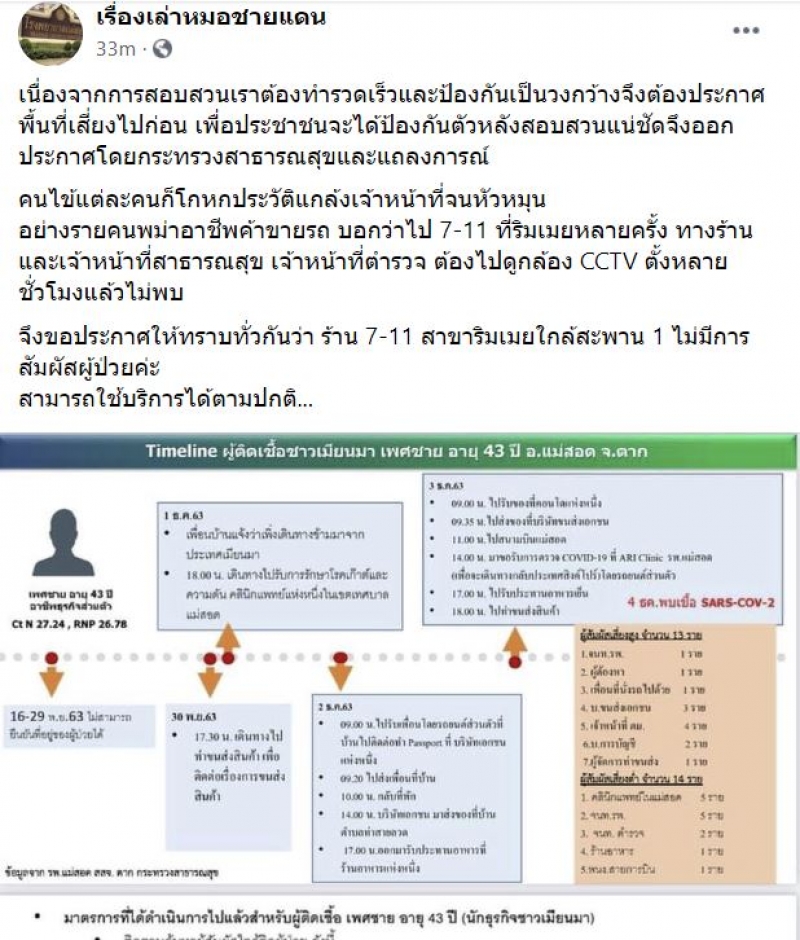 คนไข้แต่ละคนก็โกหกประวัติแกล้งเจ้าหน้าที่จนหัวหมุนอย่างรายคนพม่าอาชีพค้าขายรถ บอกว่าไป 7-11 ที่ริมเมยหลายครั้ง ทางร้านและเจ้าหน้าที่สาธารณสุข เจ้าหน้าที่ตำรวจ ต้องไปดูกล้อง CCTV ตั้งหลายชั่วโมงแล้วไม่พบจึงขอประกาศให้ทราบทั่วกันว่า ร้าน 7-11 สาขาริมเมยใกล้สะพาน 1 ไม่มีการสัมผัสผู้ป่วยค่ะ สามารถใช้บริการได้ตามปกติ