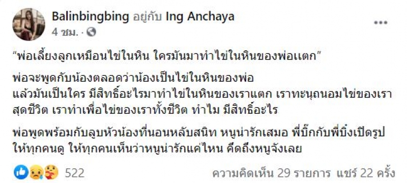 พ่อเลี้ยงลูกเหมือนไข่ในหิน ใครมันมาทำไข่ในหินของพ่อเเตก พ่อจะพูดกับน้องตลอดว่าน้องเป็นไข่ในหินของพ่อ