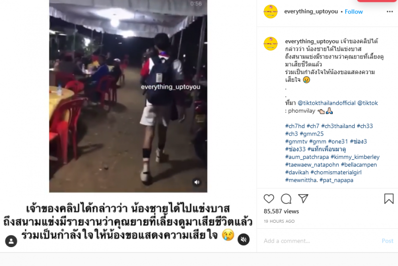 เรียกได้ว่าเป็นอีกหนึ่งคลิปที่โซเชียลเข้ามาแสดงความเห็นกันเป็นจำนวนมาก หลัง everything_uptoyou ในอินสตาแกรม ได้โพสต์คลิปน้องนักเรียนคนหนึ่งที่เพิ่งกลับมาจากสนามแข่งขันบาสเกตบอล แต่เมื่อมาถึงบ้านแทนที่เขาจะได้กอดคุณยาย ผู้ที่เลี้ยงดูเขามาตั้งแต่เด็ก กลับต้องมาเคารพศพคุณยายสุดที่รักแทน ทั้งนี้ยังได้ระบุข้อความว่า