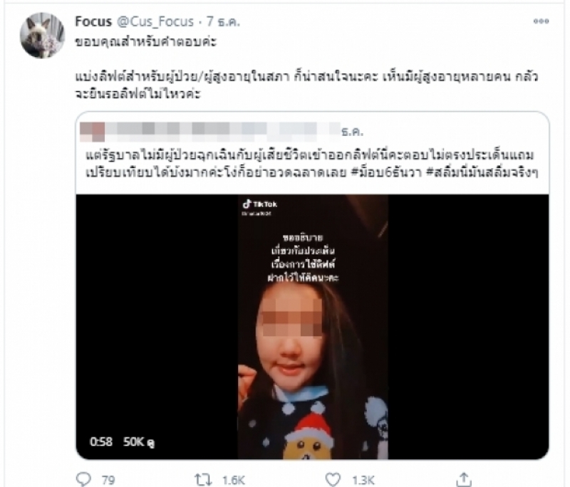 ต่อมา โฟกัส ได้รีทวีต ตอบโต้สาวคนดังกล่าว ระบุว่า ขอบคุณสำหรับคำตอบค่ะ แบ่งลิฟต์สำหรับผู้ป่วย/ผู้สูงอายุในสภา ก็น่าสนใจนะคะ เห็นมีผู้สูงอายุหลายคน กลัวจะยืนรอลิฟต์ไม่ไหวค่ะเป็นเหตุให้เป็นที่วิพากษ์วิจารณ์ในโลกออนไลน์ เป็นจำนวนมาก