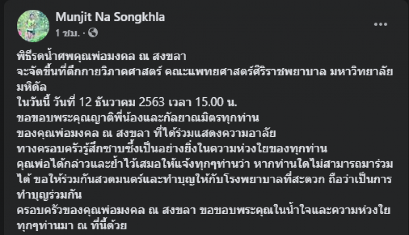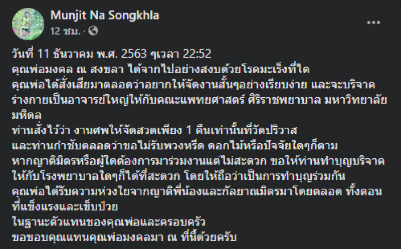 ทั้งนี้ ผู้ใช้เฟซบุ๊ก Munjit Na Songkhla หรือ นพ.มั่นจิตต์ ณ สงขลา ซึ่งเป็นลูกชายของนพ.มงคล ระบุว่า เมื่อวันที่ 11 ธ.ค.ที่ผ่านมา 22:52 น. คุณพ่อมงคล ณ สงขลา ได้จากไปอย่างสงบด้วยโรคมะเร็งที่ไต คุณพ่อได้สั่งเสียมาตลอดว่าอยากให้จัดงานสั้นๆ อย่างเรียบง่าย และจะบริจาคร่างกายเป็นอาจารย์ใหญ่ให้กับคณะแพทยศาสตร์ ศิริราชพยาบาล มหาวิทยาลัยมหิดล ท่านสั่งไว้ว่างานศพให้จัดสวดเพียง 1 คืนเท่านั้นที่ วัดปริวาส และท่านกำชับตลอดว่าขอไม่รับพวงหรีด ดอกไม้หรือปัจจัยใดๆก็ตาม