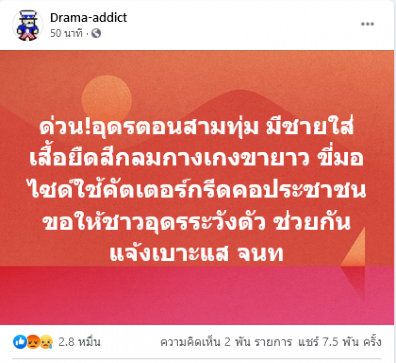 ด่วน อุดรฯ มีชายใส่เสื้อยืดสีกลมกางเกงขายาว ขี่มอไซด์ใช้คัตเตอร์กรีดคอประชาชน