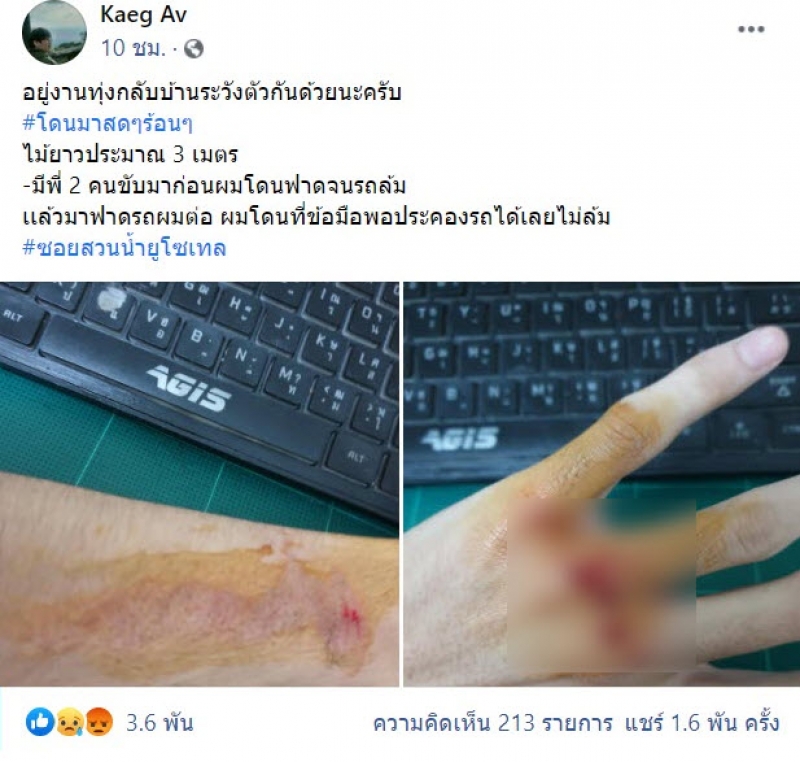 อย่างไรก็ตามมีผู้ใช้เฟซบุ๊ก Kaeg Av ได้โพสต์รูปพร้อมข้อความแจ้งเตือนหลังถูกคนร้ายทำร้ายขณะขี่รถจนบาดเจ็บบริเวณหลังมือและแขน ซึ่งเขาระบุว่า อยู่งานทุ่งกลับบ้านระวังตัวกันด้วยนะครับ #โดนมาสดๆร้อนๆ ไม้ยาวประมาณ 3 เมตร มีพี่ 2 คนขับมาก่อนผมโดนฟาดจนรถล้ม แล้วมาฟาดรถผมต่อ ผมโดนที่ข้อมือพอประคองรถได้เลยไม่ล้ม #ซอยสวนน้ำยูโซเทล