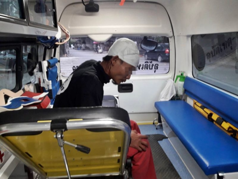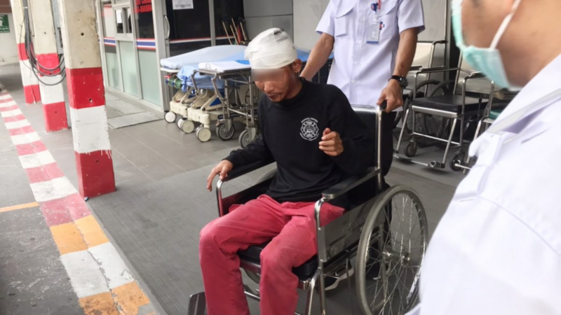 เมื่อไปถึงที่เกิดเหตุ พบนายจักรพงศ์ พ่อค้าช้าง อายุ 29 ปี นั่งเลือดอาบอยู่หน้าบ้าน เจ้าหน้าที่กู้ภัยจึงช่วยเหลือปฐมพยาบาล พบบาดแผลถูกฟันที่ศีรษะ2แผล เลือดไหลตลอดเวลา ร้องครวญครางด้วนความเจ็บปวด ก่อนจะรีบนำตัวส่ง รพ.สต.เพ ระยอง แพทย์เย็บบาดแผลทั้งหมด 10 เข็ม