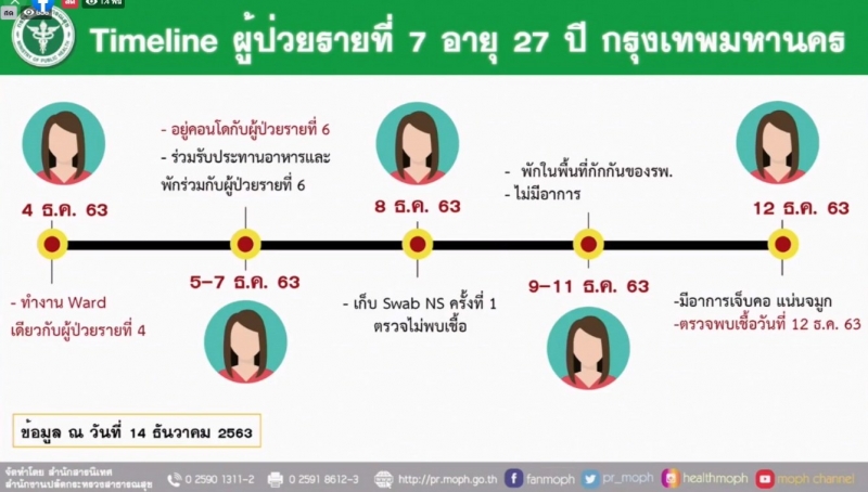 ทางด้านนายแพทย์โสภณ เอี่ยมศิริถาวร ผู้อำนวยการกองโรคติดต่อทั่วไป กรมควบคุมโรค ได้เผยไทม์ไลน์ ผู้ป่วยรายที่ 7 ดังนี้